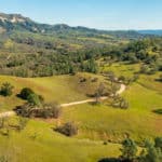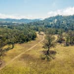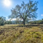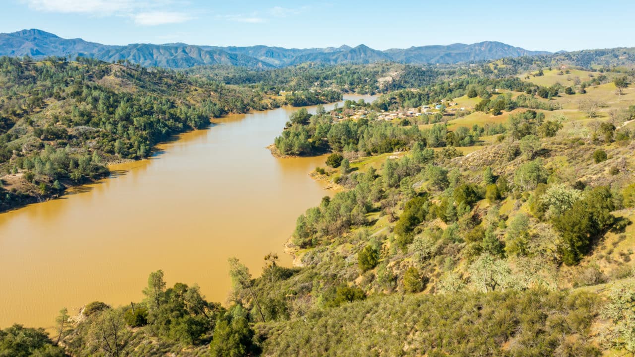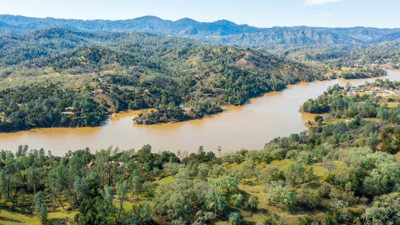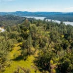 Expansive lake and mountain views with rolling hills and mature oak trees
