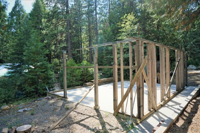 • Detached cement slab, framework and most materials for an oversized garage are there for your completion.