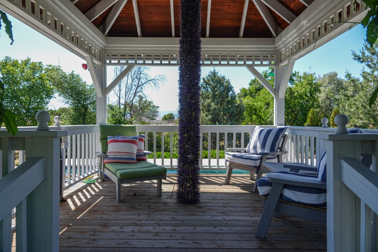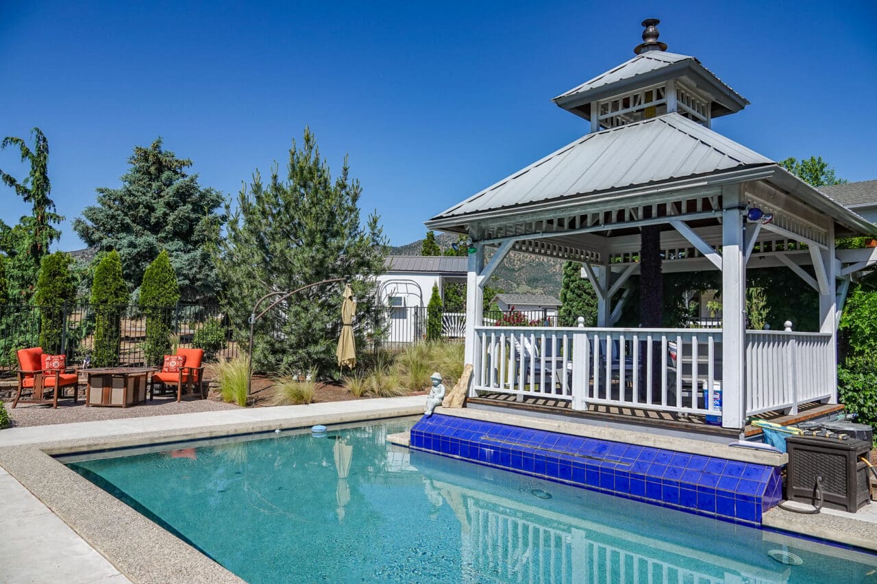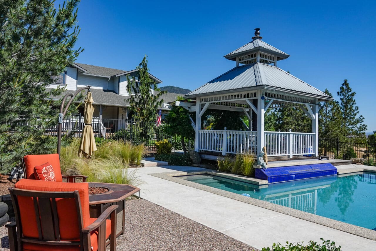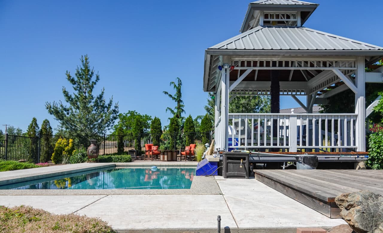 Beautiful and well-maintained Siskiyou County country home just 15 minutes outside of Yreka! This mostly level property is beautifully landscaped and includes a seasonal creek, seasonal pond, swimming pool, trees and pretty views! You can enjoy Mt. Shasta views from the property, as well as local hills. It's fenced and horses or other animals are allowed. The house is two stories with wrap-around porches on several sides and has an attached three car garage. Downstairs, enjoy a spacious living room and kitchen with pantry and island. There’s one large bedroom, with a sitting room and bathroom downstairs, as well as a second half bath, plus an office and a sunroom with hot tub. Upstairs there are two bedrooms and bathrooms. From the front porch take the walk way to the gazebo and a water feature next to the pool. A nice patio, several areas for seating & a variety of landscaping on automatic irrigation all contribute to the relaxing atmosphere. A finished shed, with non-permitted toilet, sink and it’s own heat/ac unit makes a great space for hobbies, as well as a pump house and other sheds for storage and tools.