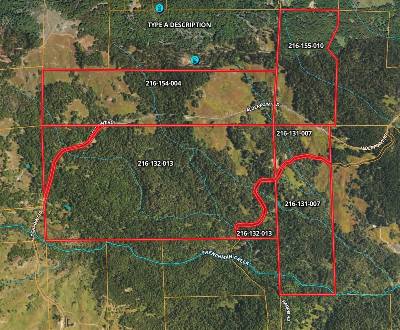 Located in the scenic town of Alderpoint, California, this magnificent property spans an expansive 738 acres of pristine timberland. Nestled in the heart of nature's bounty, this property offers a unique opportunity as both an idyllic dwelling or a premier hunting area.
