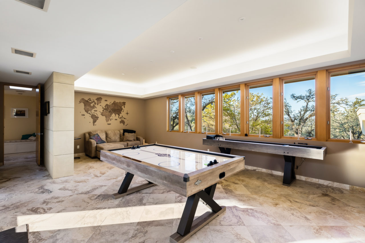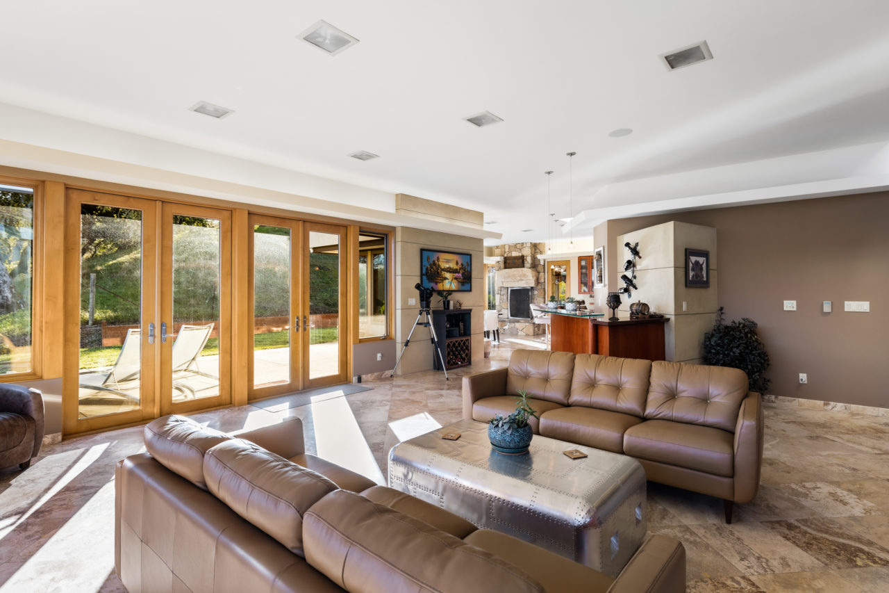 Winding through the manicured forest until emerging to an uninterrupted and awe-inspiring vista out over the entire Ukiah Valley is one’s first impression coming into the 156.9 acres of Five Star Ranch. Upon passing through the entrance gates, the road shepherds you through an olive grove that breaks out to reveal what is the Ranch’s masterpiece - a 5,500 sq ft 3 bedroom, 5 bath Frank Loyd Wright-inspired house custom designed and built by Thomas Hise in 2007. Exuding refined modernity, entering the house is like entering a cathedral with towering ceilings rising in clean lines and sunlight raining down on you through the well-positioned skylights. Accompanying this is the sound of flowing water circulating inside and outside and creating a Koi pond underneath the floating staircase that leads you to the Great Room. With radiant floors throughout and an architectural design incorporating passive solar, the house remains a consistent and comforting temperature. A house of this magnitude is built for entertaining, and the Chef’s Kitchen does not disappoint. With granite counters, two Viking stoves, a Viking Range with an indoor grill and flat top, Sub- Zero Fridge, stainless steel prep counters, a custom-designed pantry, an appliance garage, and a full bar with a wine fridge, there is not much wanting. Out of the Great Room, with its large fireplaces and endless views across the horizon, one opens the french doors to the entertainment patio and 45-foot Infinity Pool and Jacuzzi. If tranquility and shade are desired, then the grapevine pergola at the back courtyard is the place to be. The Master en suite has his and her closets, french doors to separate balconies, luxurious bathroom with an Italian marble bath.