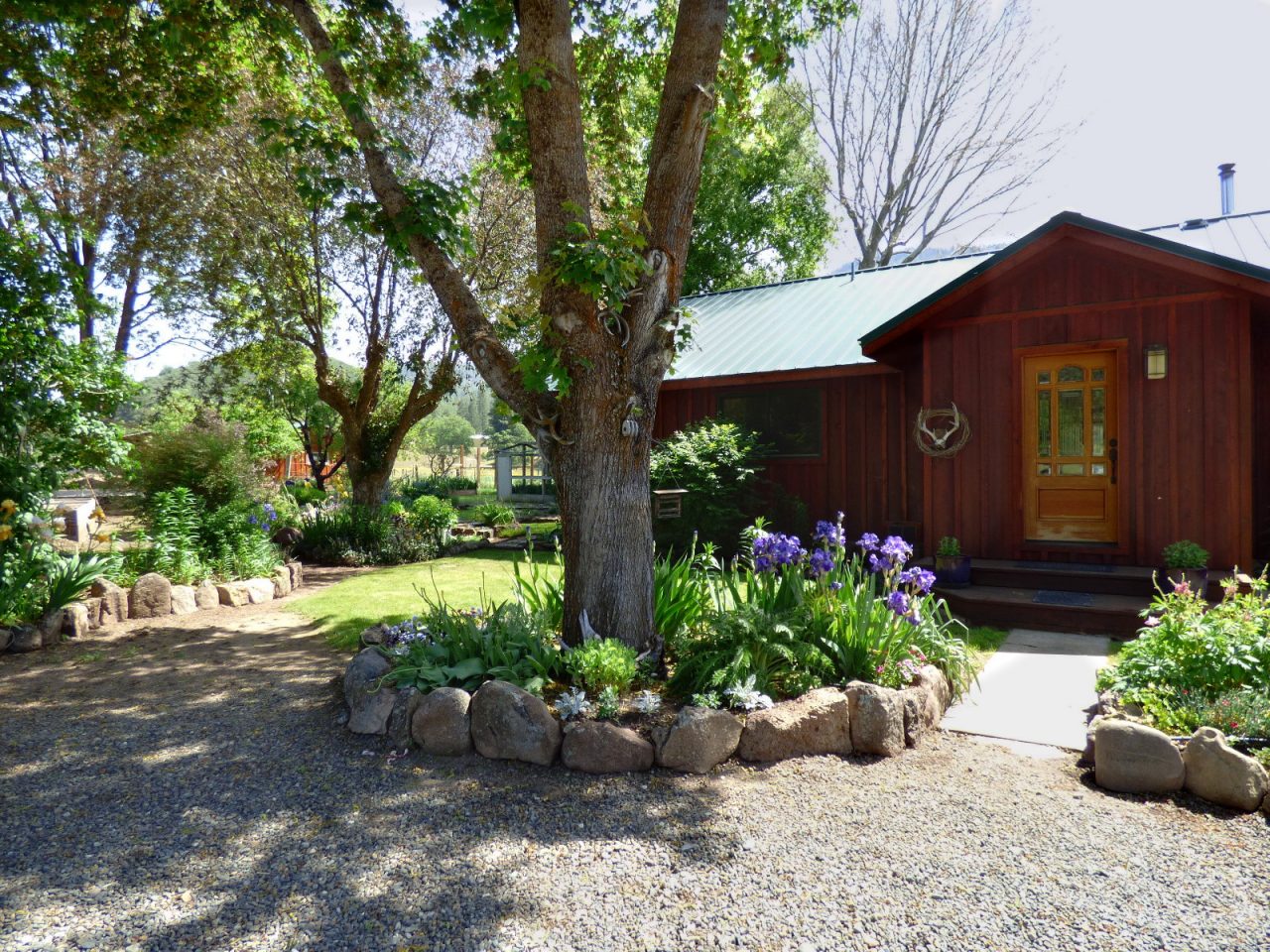 Absolutely charming country homestead, with pastures, gardens, fruit trees and so much more! This lovely 2,212 sf 3 bed, 2 bath home has been remodeled extensively and has many custom touches including Viking appliances, hand pounded copper sinks, madrone wood flooring in the living room, quarter sawn red oak in the kitchen, and much more. The property is on well and septic, with a net metering solar system, three zone Lennox heating and a woodstove. There are multiple outbuildings including garage/shop, parking/tractor barn, greenhouse and more. The garden is 3,750 sf, plus asparagus beds, herbs, grapes and a wide variety of fruit trees. The pastures are irrigated (multiple irrigation systems) and a seasonal creek runs along the driveway and yard. The landscaping is charming, complete with a small pond and fountain. This could be a great horse property, hobby farm, farmer’s market garden, etc. as the land is all usable with good soil and irrigated pastures.