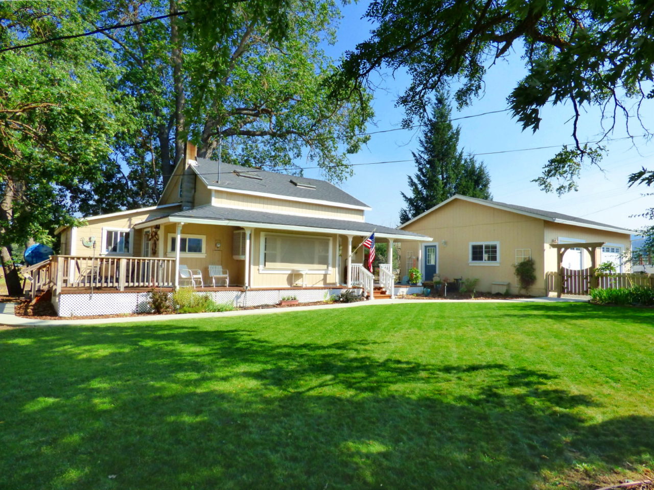 This lovely home feels bright and welcoming the moment you step through the door! Remodeled and upgraded extensively through the past few years, it now offers a light cheerful atmosphere! Inside, enjoy pretty wood ceilings, large windows, and a wood stove in the living room. The kitchen and dining area are open with a nice row of windows also. The kitchen has an island with an eating bar, tile counters, recessed lighting, and plenty of storage. The bathrooms have also been remodeled and the upstairs bedroom has pretty vaulted wood ceilings and two skylights. There are wrap-around porches, a nice lawn, and pretty landscaping. A 29x32 garage offers a bonus room, (easily a workshop) several parking places, and still room for storage. It's centrally located in Scott Valley, close to conveniences. Make an appointment to see it today!