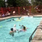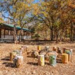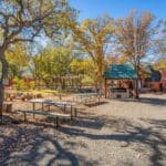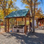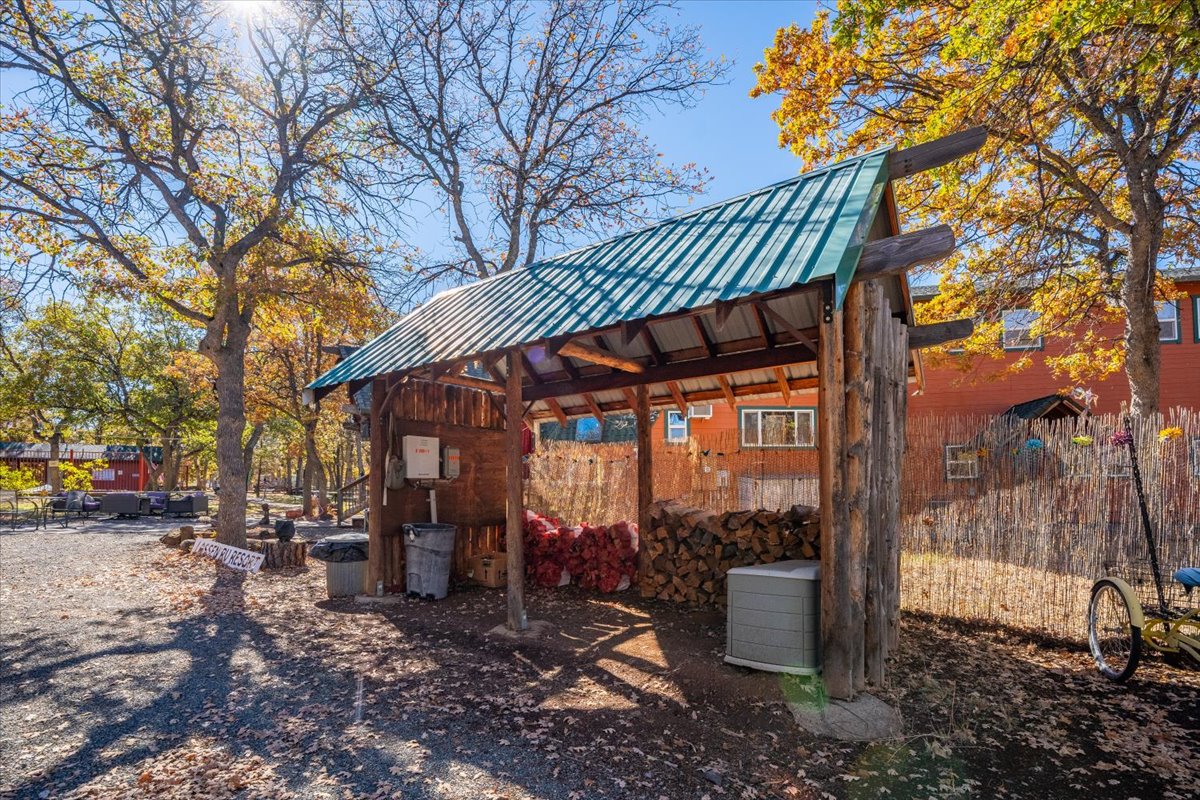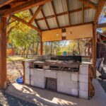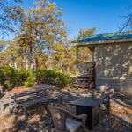 - Picnic gathering area, covered propane BBQ grill, pavilion, horseshoe pits, volleyball net and circle of stone fire pit ring.