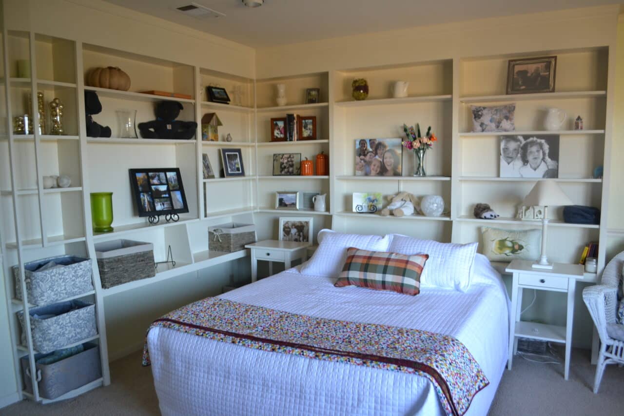 - First bedroom can be accessed from family room or east wing hallway. Features two walls of built in bookshelves, closet, carpet flooring and view of side yard and Mt. Shasta.