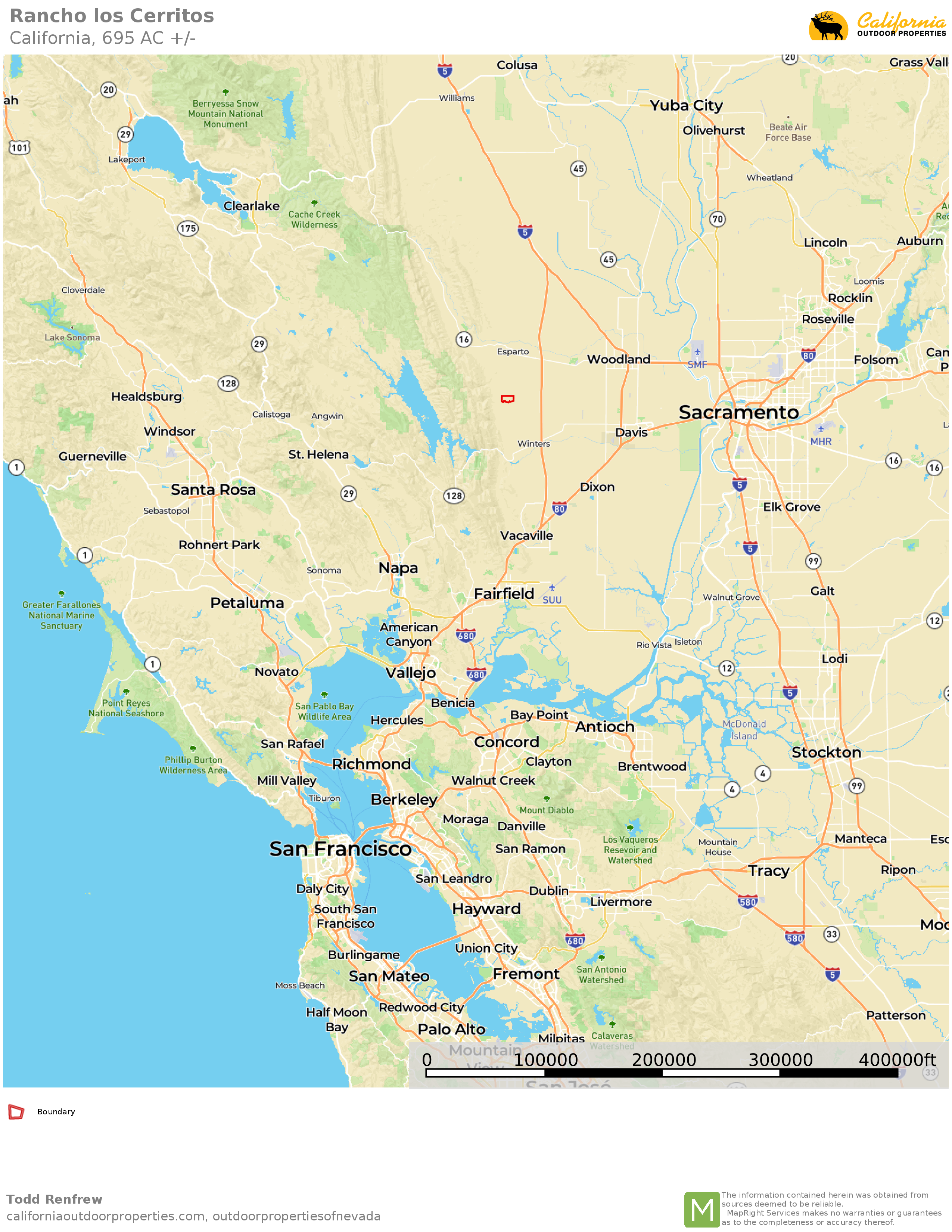 The very private and beautiful 695 ± acre Rancho los Cerritos consists of rolling grass-covered hills with beautiful views just minutes from downtown Winters, CA. The ranch sits at approximately 400-foot elevation. Water consists of two creeks, one on the northern portion and one on the southern portion of the ranch, and a pond, located on the western portion. The ranch has great grazing land and is presently leased out to run cattle. In addition, recreational pursuits include hunting, horseback riding, and ATVing. There is a conservation easement on a portion of the ranch.