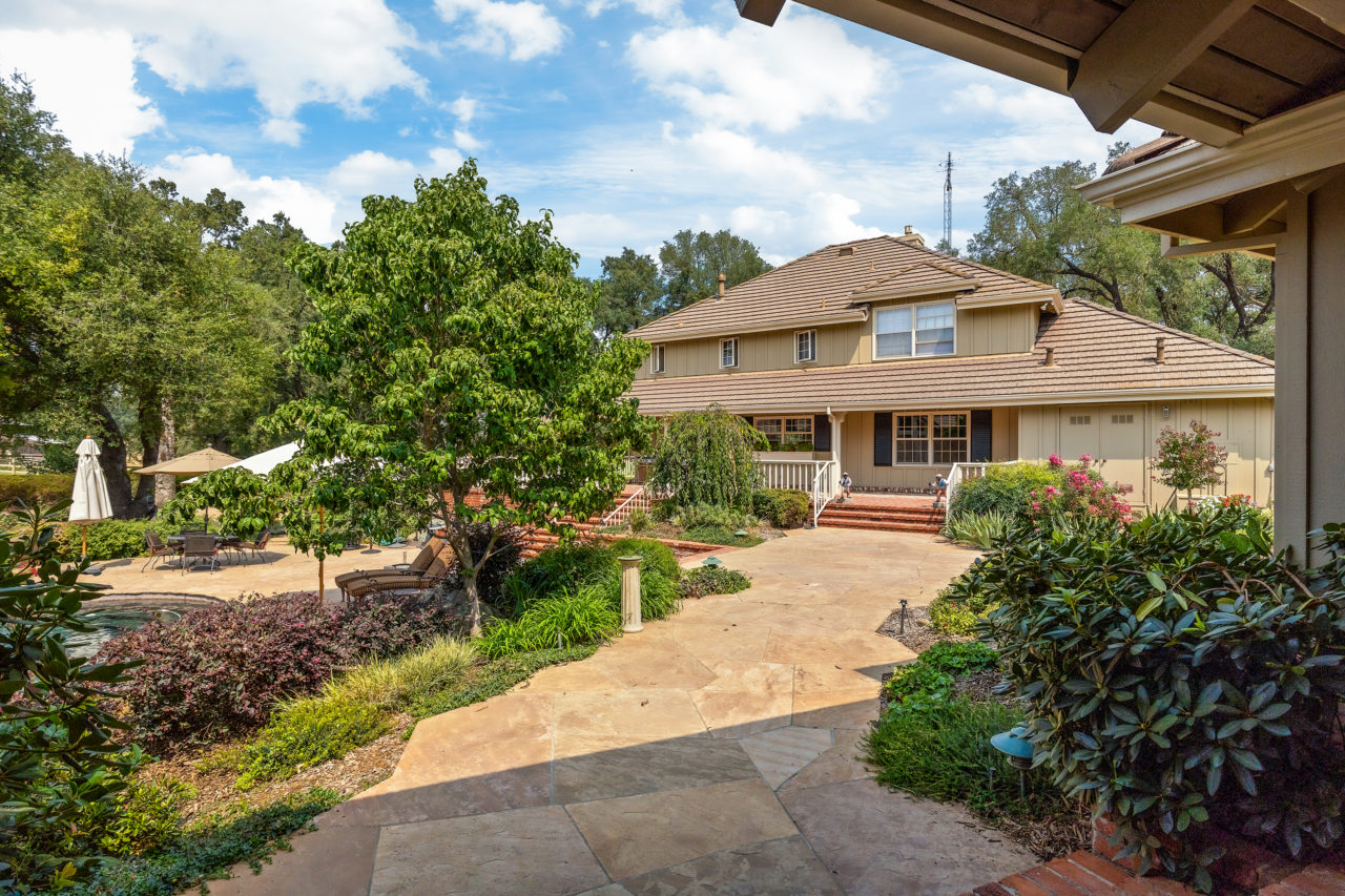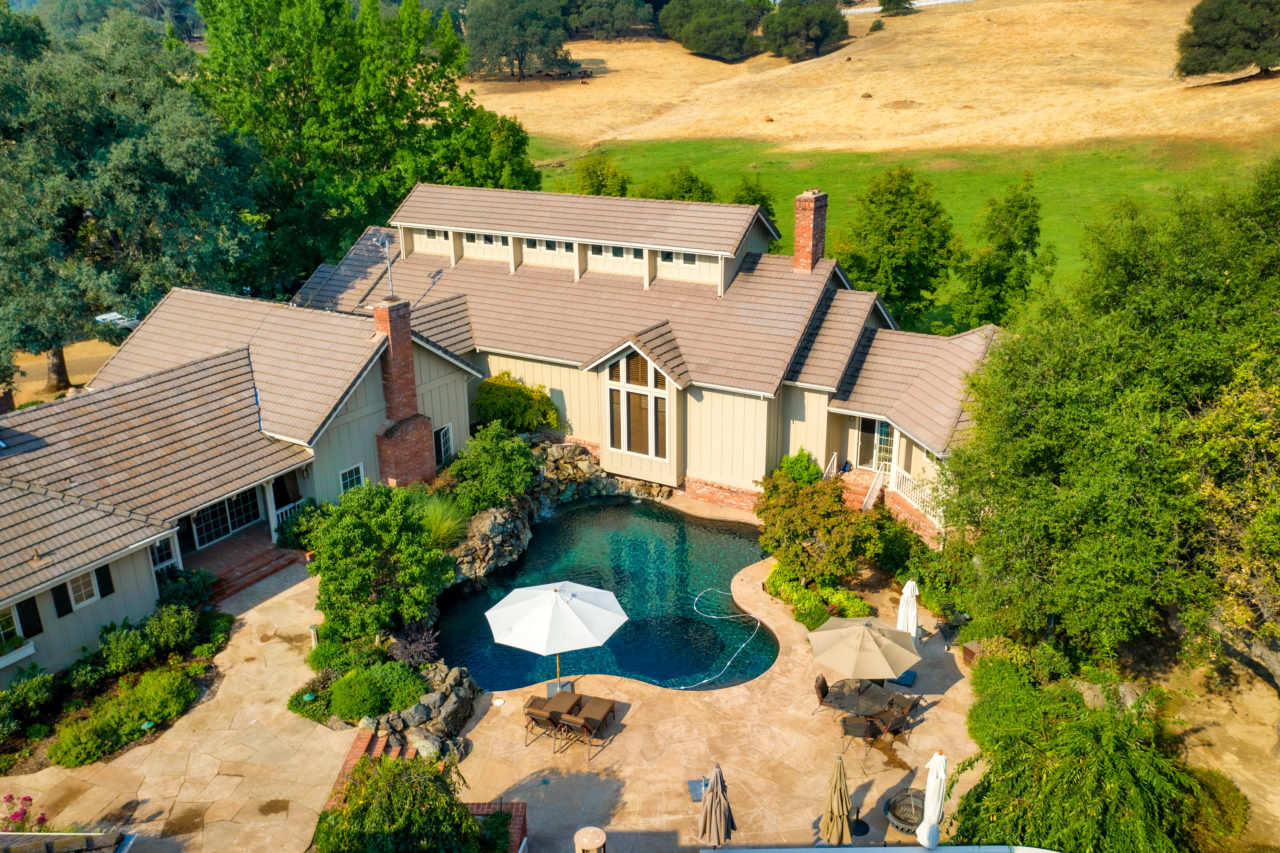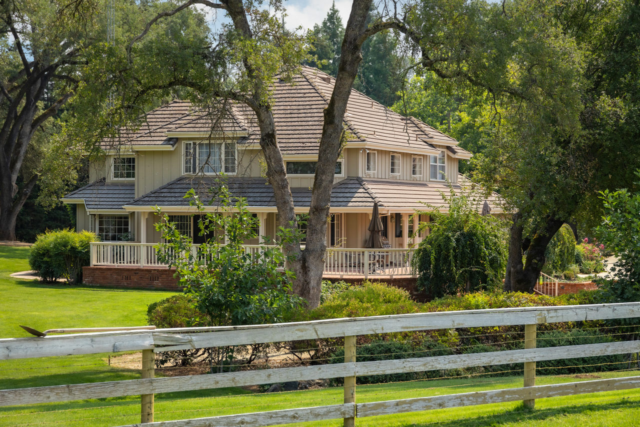 Welcome to Villa Cielo Ranch, a stunning, private, and secure compound on 76+ acres mere minutes from Highway 50, downtown Placerville, and nearby El Dorado Hills.  Enter through an impressive stone and iron front gate and make your way up the drive to the sparkling stone fountains welcoming you home.  The complex includes a 3770 SF luxury residence, a 3 bedroom guest cottage, an Ahwahnee Lodge with rock-wall, kitchen, bar, & 2 fireplaces (could be used as a wedding venue, banquet hall, or corporate retreat), an indoor Spa room, and a gymnasium, all surrounding a Pebble Tech pool with rock waterfall, flagstone patios, and multiple decks, creating a private country club feel.  Fenced and cross-fenced, the outbuildings include a wooden barn with cement slab floor and tractor overhang,  and 40 Acres of irrigated pasture.  There is a year-round pond fed by Indian Creek, which provides water rights to 130 Acre-Feet.  Cattle lease is year-round.  There is an owned Solar Array, next to the large vegetable gardens and fruit tree orchard.